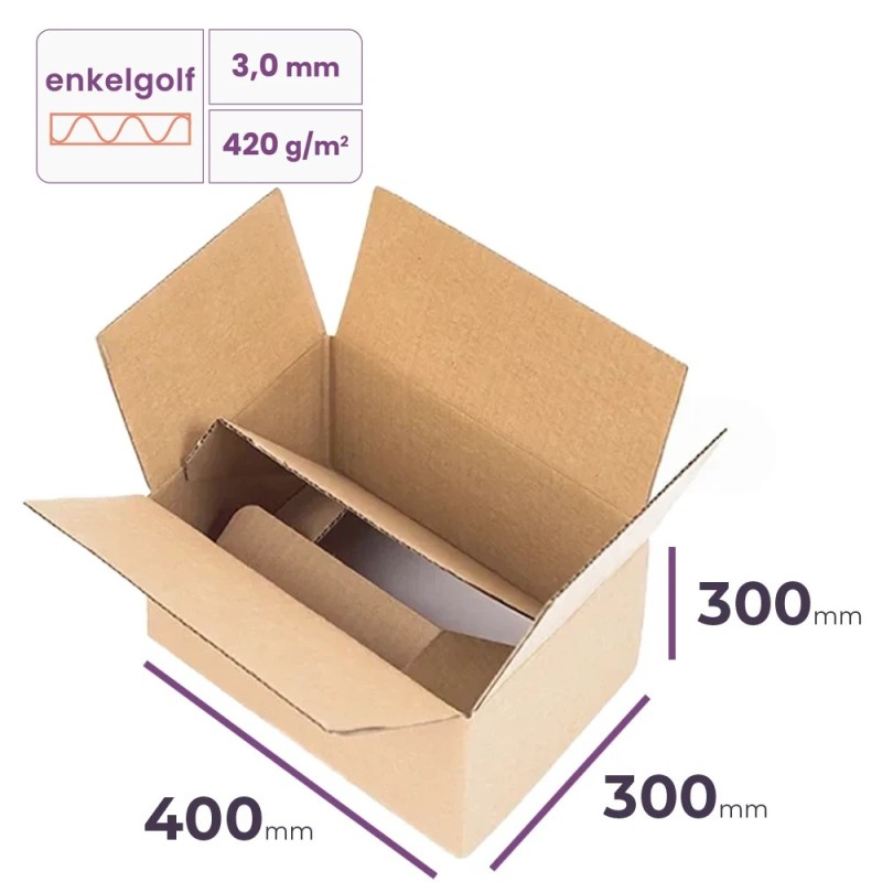 Deze middelgrote kartonnen doos met automatische bodem 400x300x300 mm heeft een binnenmaat van 390x290x290 mm en is gemaakt van enkelgolf B golfkarton met een gramgewicht van 420 g/m². De maximale capaciteit bedraagt 36 liter. Dit autolock doosje is vervaardigd uit 100% biologisch afbreekbare materialen en beschikt over het FSC®-certificaat. Het ontwerp volgens fefco 701 garandeert een stevig en betrouwbaar product, ideaal voor het verzenden van middelgrote zendingen. Dankzij de automatische bodem is het doosje zeer snel en gemakkelijk in gebruik.