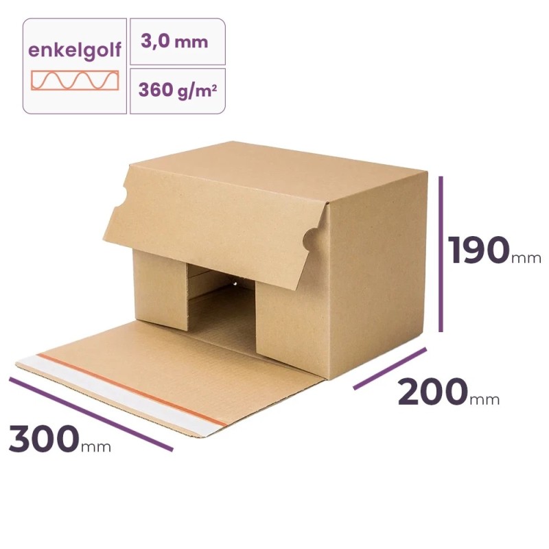 Deze paraatdoos met plakstrip 300x200x190 mm is ideaal als doos voor mokken en doos voor delicate elektronica. De stevige, middelgrote kartonnen doos met automatische bodem biedt betrouwbare bescherming voor breekbare en gevoelige producten tijdens het transport. Dankzij de plakstrip is het sluiten van de doos eenvoudig en snel, wat het inpakproces in jouw webshop aanzienlijk versnelt. Deze doos is perfect afgestemd op de afmetingen en eisen als doos voor: PostNL Gemiddeld Pakket en DHL Box L.
