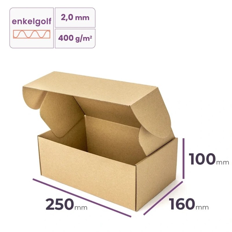 Deze postdoos 250x160x100 mm is ideaal als verzenddoos voor cosmetica en andere delicate producten. Ook uitstekend geschikt als doos voor elektronica zoals accessoires en kleine apparaten. Dankzij het praktische formaat en stevige materiaal beschermt deze postdoos met bovenklep jouw goederen tegen beschadigingen tijdens transport. Bovendien voldoet hij aan de eisen van doos voor: PostNL Klein Pakket, DHL Box M, wat verzending makkelijk en betrouwbaar maakt.