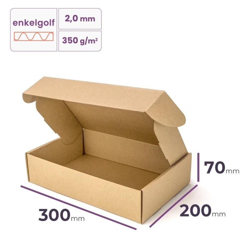 De postdoos met bovenklep 300x200x70 mm is uitermate geschikt voor het verzenden van cosmetica en elektronica. Denk aan make-upsets, verzorgingsproducten, kleine gadgets en accessoires. Dankzij het stevige karton blijven je producten tijdens het transport goed beschermd en komt de doos professioneel aan bij je klant. Geschikte doos voor: PostNL Klein pakket, DHL Box S.