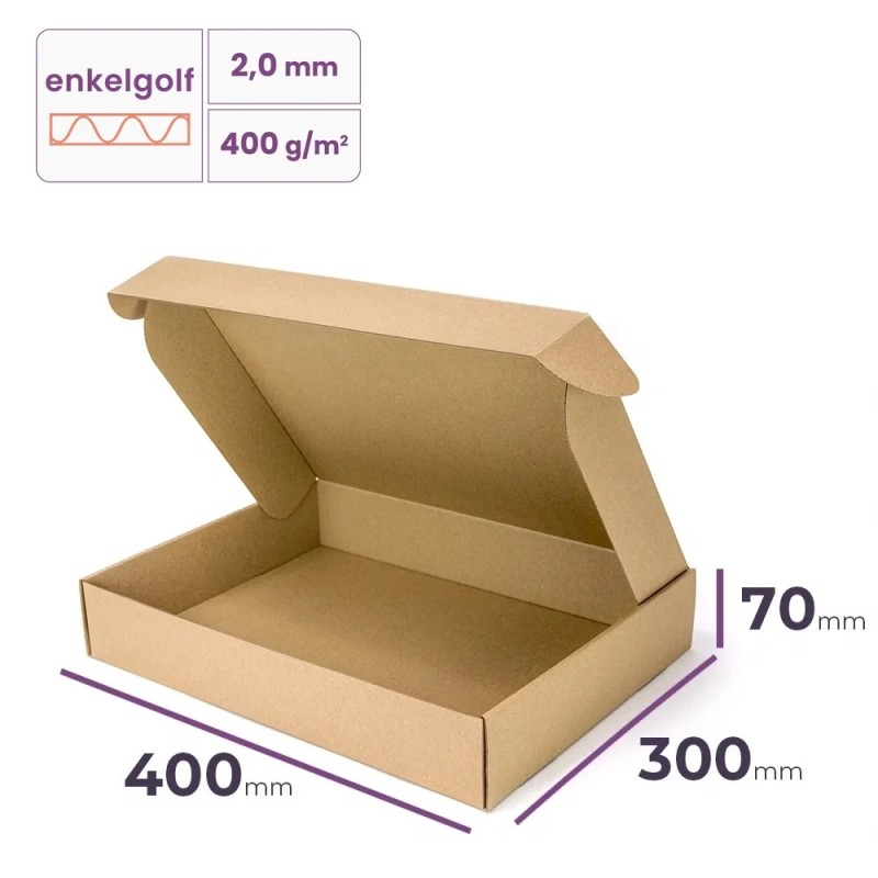 - Sterkte – Dankzij het enkelgolf karton van 400 g/m² is de doos stevig genoeg voor dagelijks verzenden.
