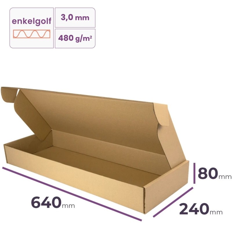 De pakketdoos 640x240x80 mm is speciaal geschikt voor het veilig verzenden van doos voor technische tekeningen of doos voor rolgordijnen, posters, en andere lange artikelen. Dankzij de stevige constructie en het langwerpige formaat is deze doos een uitstekend alternatief voor ronde verzendkokers en biedt hij extra stabiliteit tijdens het transport. Daarnaast wordt deze doos steeds vaker gebruikt voor het verzenden van auto-onderdelen, industriële producten en artikelen uit de tuinbranche. Zolang het product binnen de afmetingen past, is deze grote postdoos met bovenklep de ideale pakketdoos voor een professionele en veilige verzending. Geschikte doos voor: PostNL Gemiddeld Pakket, DHL Box XL.