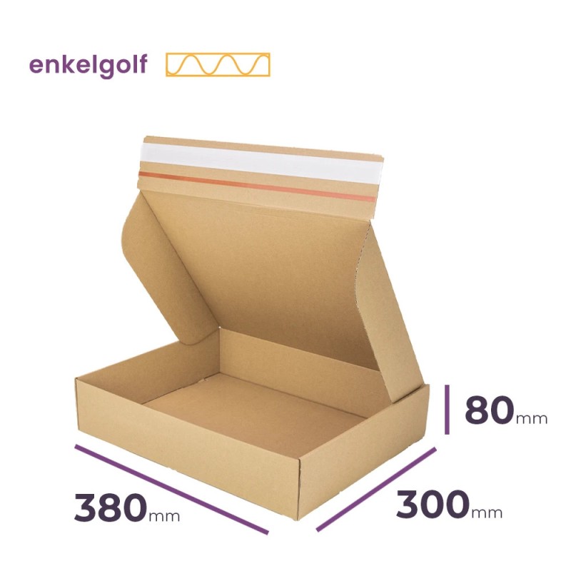 Deze kleine postdoos met klepsluiting met afmetingen 380x300x80 mm is ideaal voor het veilig verzenden van kledingstukken, bordspellen en andere middelgrote artikelen. Geschikt als verzenddoos voor kleiding en doos voor bordspellen. De praktische klepsluiting met kleefstrip maakt het inpakken eenvoudig en snel terwijl de zéér handige zwerfal het openen voor de ontvanger vergemakkelijkt. Dit platte doosontwerp is perfect afgestemd op de behoeften van webshops en kleine bedrijven die betrouwbare en stijlvolle verzendoplossingen zoeken. Voor extra bescherming tegen vocht en vuil kan de doos gecombineerd worden met een geschikte folie. Geschikte doos voor: PostNL Gemiddeld Pakket, DHL Box XL.